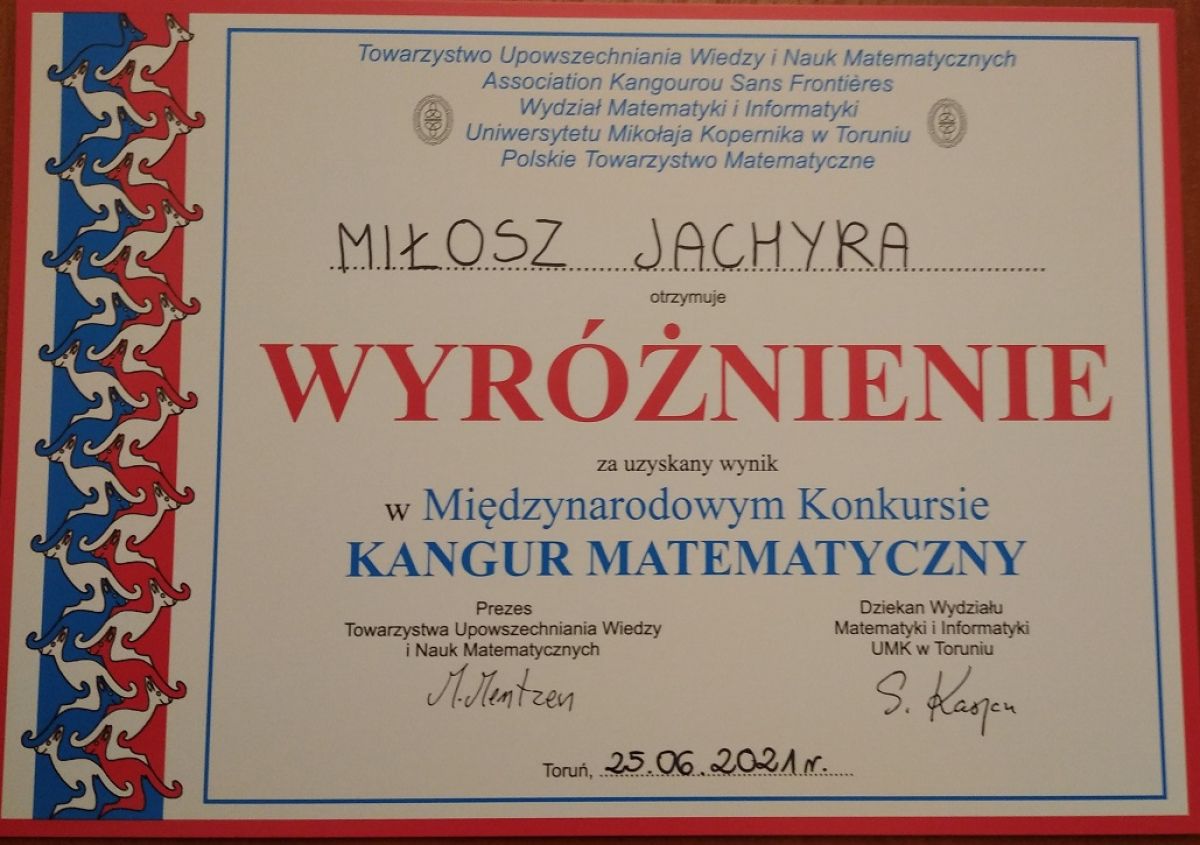 Wyróżnienie w międzynarodowym konkursie „Kangur matematyczny 2021”