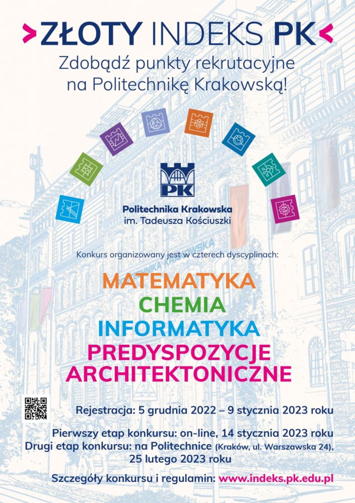 Celem konkursu jest zwrócenie szczególnej uwagi młodzieży szkół ponadpodstawowych na przedmioty: matematyka, chemia, informatyka i predyspozycje architektoniczne, przygotowujące do podjęcia studiów technicznych na Politechnice Krakowskiej.
