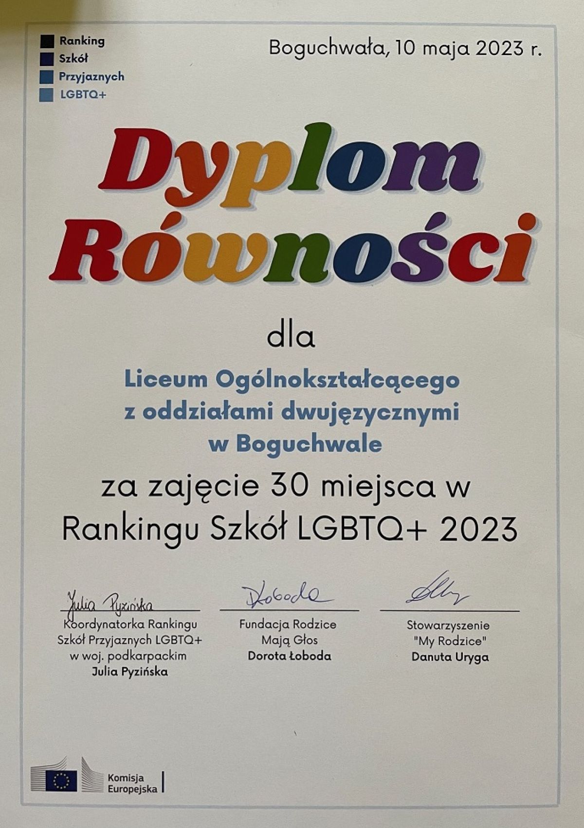 22 maja społeczność Liceum została wyróżniona oficjalnym wręczeniem Dyplomu Równości oraz szyldu z mottem Rankingu „Bezpieczna Szkoła 2023”. Honorową tablicę reprezentantom samorządu uczniowskiego i dyrektorowi Liceum wręczyła Julia Pyzińska, koordynatorka ranking