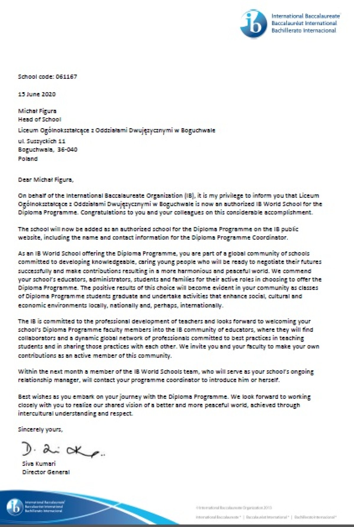 Mamy ogromną przyjemność poinformować, że dziś otrzymaliśmy list podpisany przez Panią doktor Siva Kumari Dyrektora Generalnego International Baccalaureate Organization (IB), która informuje o nadaniu Liceum Ogólnokształcącemu z Oddziałami Dwujęzycznymi w Boguchwale autoryzacji IB, a zarazem tytułu World School for the Diploma Programme.